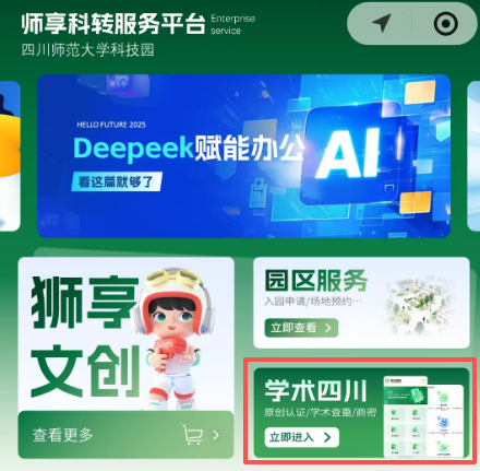 在学校统筹部署与相关职能部门的大力支持下,2023年12月,四川师范大学科技园与四川省知识产权发展研究中心正式签约,建立长效协同合作机制,共建 “知识产权工作站” 与 “四川师范大学科技园原创认证文创保护平台”,为学校知识产权服务体系筑牢根基。2025年底,依托前期成熟合作基础,四川师范大学科技园正式引入“学术四川”平台,面向全校各学院、科研团队、师生创作者及园区各类创新主体,提供原创认证保护、学术查重、智库人才对接、学术成果转化、商业秘密风险防控等一站式服务。