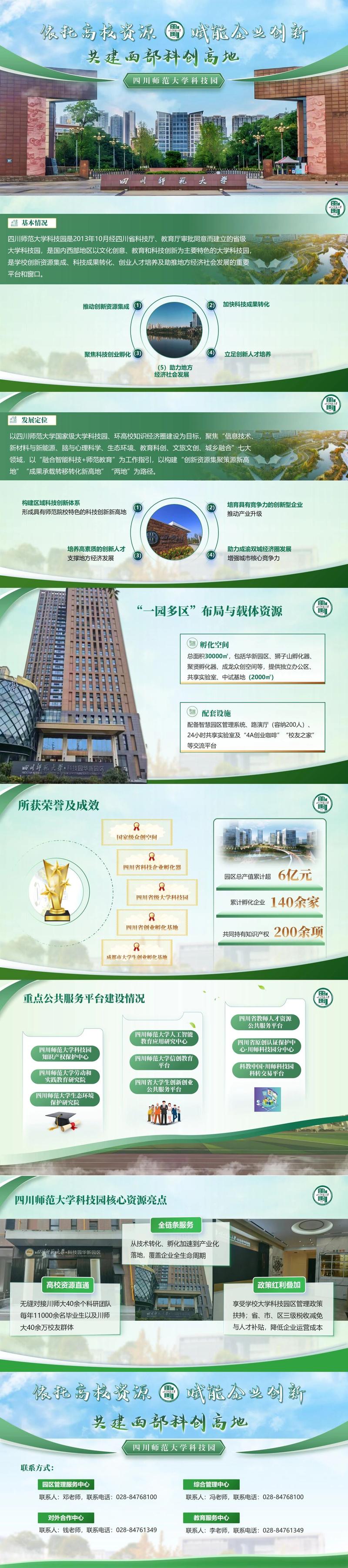 四川师范大学科技园实行"一园多区"的园区布局,建设华新园区、狮子山孵化器、聚贤孵化器、成龙孵化器等四个孵化载体,孵化面积近15000;创立创新创业交流平台——“四川师范大学校友之家”、“4A创业咖啡”;设置园区及技术成果综合管理中心、教育培训中心、文创中心、劳动和实践教育研究院四个功能区;承载“四川师范大学劳动和实践教育研究院”、“四川师范大学生态环保研究院”、"四川师范大学青少年文化艺术培训中心"、“四川师范大学旅游与城乡规划研究院”、“四川师范大学人工智能教育应用研究院”、“四川师范大学信创教育平台”等校、地、企平台集成项目;建设“四川省教师人才资源公共服务平台”、“四川省大学生创新创业公共服务平台”、“科教中国•四川师大科技园科转交易平台”等多个专业类公共服务技术平台;先后服务入园企业或创业项目140余个(专利授权企业5家、高新技术企业4家,科技型中小企业5家),共同持有知识产权成果200余项,产业化4项,园区总产值规模累计超6亿元;举办创新创业活动近500场次,培养创新创业人才15000余人。